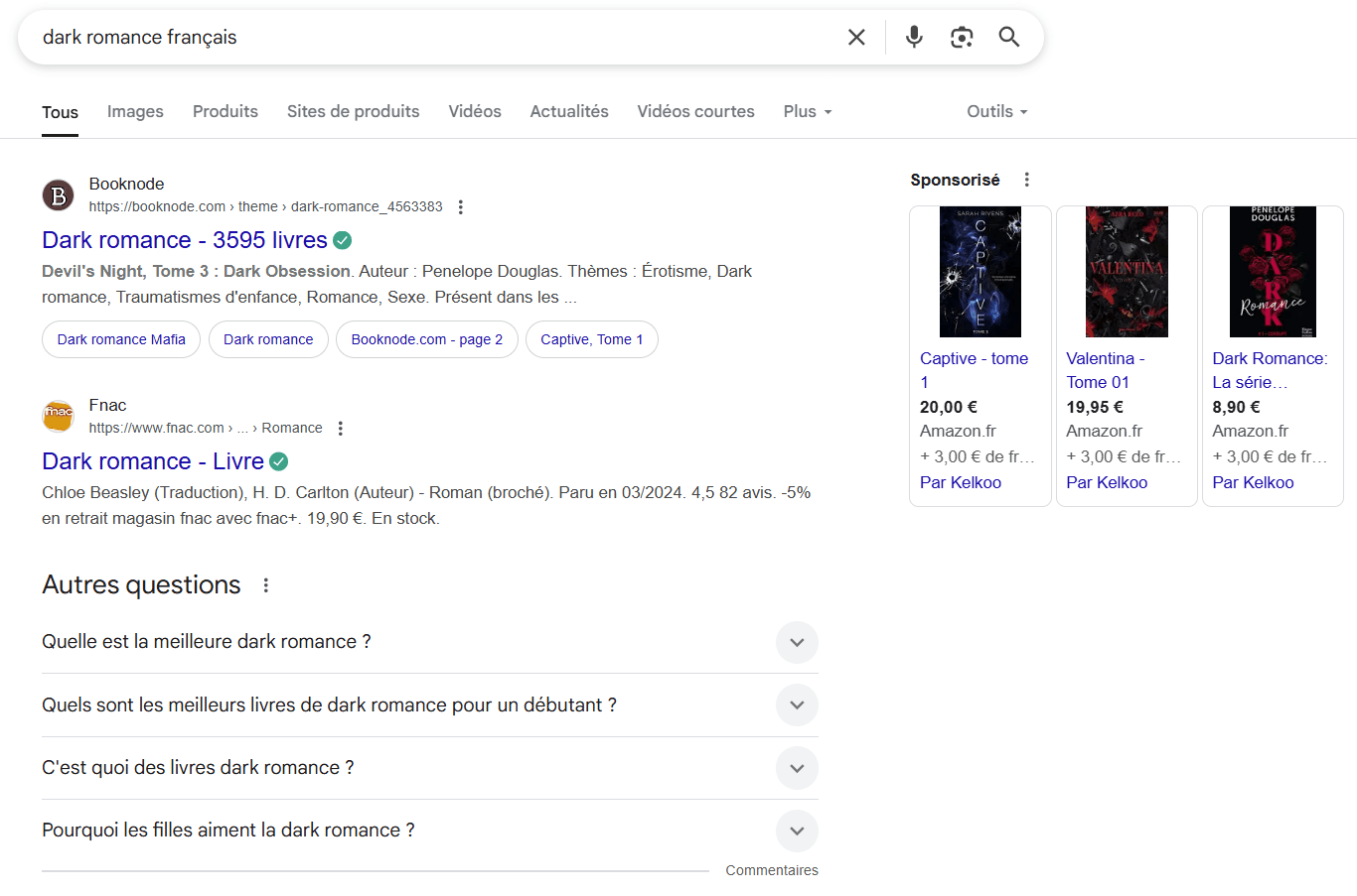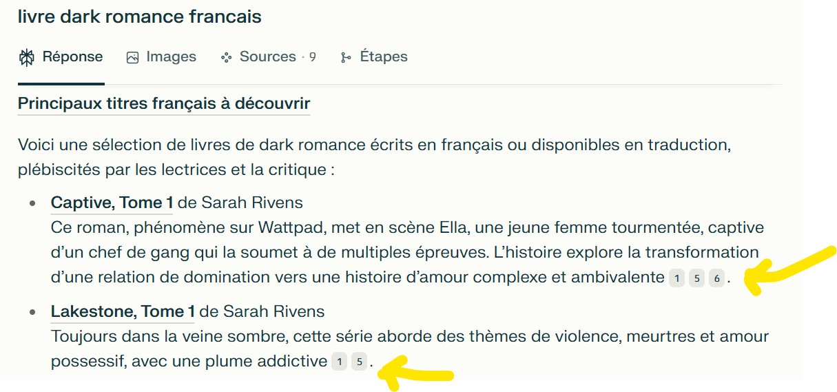 Regardez ce que donne Perplexity pour « livre dark romance français » :